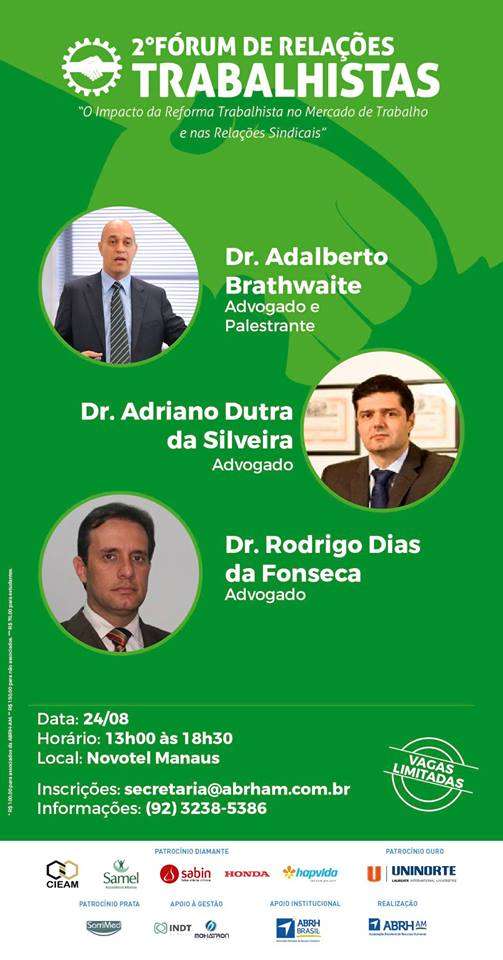 No dia 24 de agosto, a Associação Brasileira de Recursos Humanos, seccional Amazonas, tem um compromisso importante com a comunidade local: oferecer mais um evento de qualidade. Nessa oportunidade, o tema será “O Impacto da Reforma Trabalhista no Mercado de Trabalho e nas Relações Sindicais”, e será apresentado em formato de painéis.